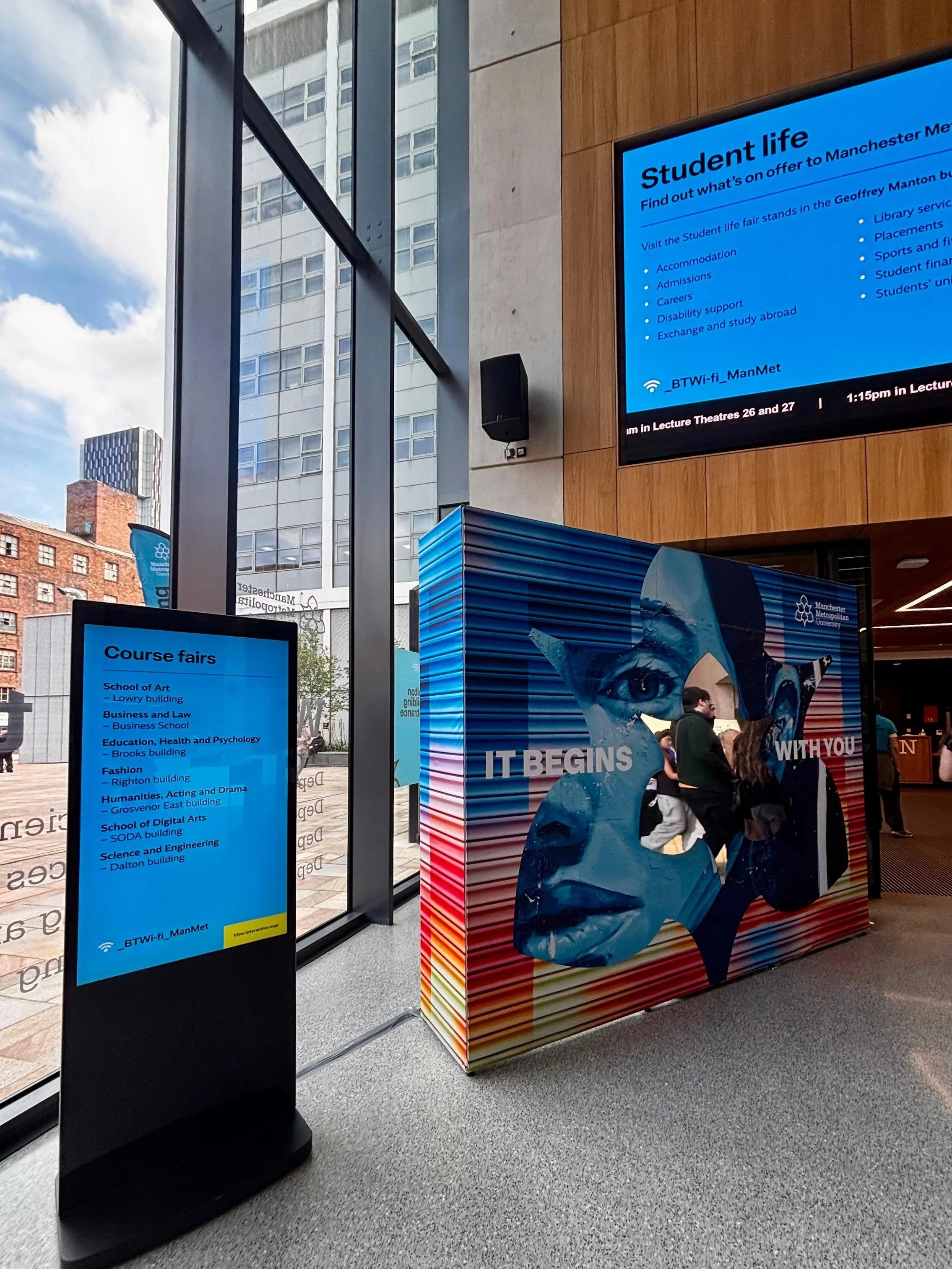 We directed the creative vision for the open day, meticulously shaping the visual language and narrative across the campus. Using digital totems, interactive maps, way-finding and more. Our approach balanced functionality with innovation, creating an environment that was both intuitive to navigate and inspiring to explore, while representing Manchester Metropolitan University’s progressive and future-focused identity.
